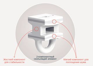Первоклассные 2C бегунки и ролики (патент заявлен) в сочетании с карнизами со специальным покрытием позволяют портьере двигаться плавно и бесшумно. При производстве этих бегунков используются два материала: твердый компонент, обеспечивающий стабильность, и мягкий "наполнитель", поглощающий шум. Конечный результат - беспрецедентная тишина.
