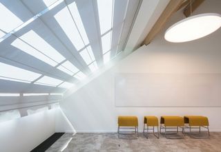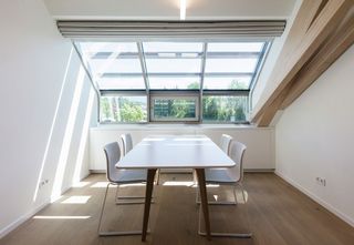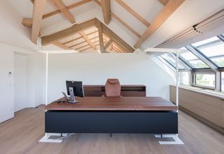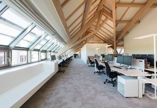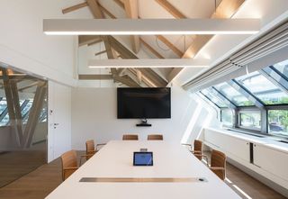 Im Obergeschoss befindet sich die Bürowelt des „Neuen Arbeitens“: Flexibel bespielbare Anordnung von Einzelbüros und fein gegliederte Grossraumbüros. Über 60 motorisierte Skylight-Systeme fügen sich rundum perfekt in die markante Dachkonstruktion aus Buchenholz ein. Der auf der Rückseite aluminiumbedampfte Aluscreen Futura sorgt für hohe Reflexionswerte und verbessert dadurch das Raumklima. Für die Bildschirmarbeitsplätze bieten die Silent Gliss Systeme einen hervorragenden Blendschutz und sind auf Knopfdruck bedienbar.